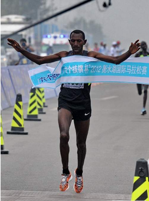 【#衡水湖國際馬拉松賽# 沖過終點】9月22日,埃塞俄比亞選手梅孔嫩在比賽中沖過終點。當日,在河北省衡水市舉行的2012年衡水湖國際馬拉松比賽中,埃塞俄比亞選手梅孔嫩以2小時08分07秒的成績奪得男子組冠軍。 新華社記者楊世堯攝